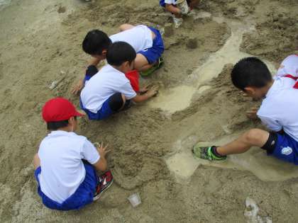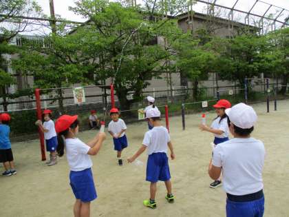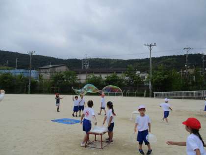 生活科「なつだ とびだそう」の学習で、学年全体で活動しました。運動場で、シャボン玉や水鉄砲、砂遊びをしました。大きなシャボン玉や水鉄砲での的あて、砂場での川づくり…などなど、体中を使って存分に活動を楽しみました。