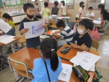 自分が「あったらいいな」と思うものを絵に表し、友達と質問し合いながらくわしく考えてきました。