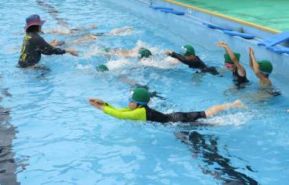 回数を重ねるごとに、泳げる距離が伸びてきました。初めは顔をつけられなかった子どもたちも,顔をつけてけのびやバタ足ができるようになってきました。