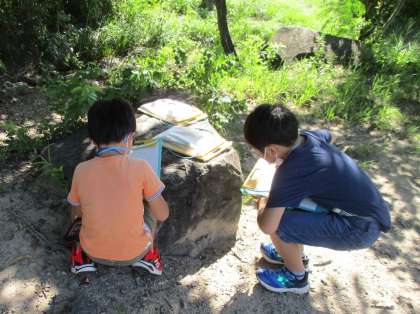 「動物のすみか」の学習で、ビオトープや中庭や畑に生き物を探しに行きました。子どもたちは、バッタやトンボ、ダンゴムシなどを見つけていました。