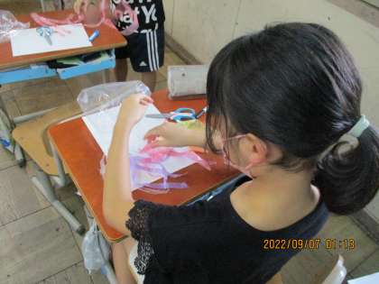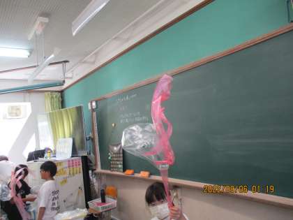 ビニール袋やスズランテープを使い、サーキュレーターの風にのせて飛ぶ作品を作りました。子どもたちは,どうすればよく飛ぶか考えながら作品を仕上げていました。
