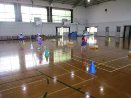 コーンを回ったり、障害物を飛び越えたりしながら、折り返しリレーに挑戦しました。