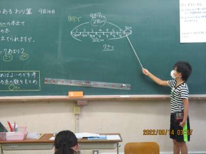 あまりを扱いをどうするかという問題について考えました。図を使って、あまりの分を答えに足すのか足さないのか考え、自分の考えを説明し合いました。
