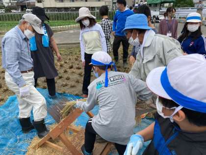 千歯こきと足踏み脱穀機を使って脱穀しました。昔から稲作をされてきた地域の方も、稲作を始めた時にはもう千歯こきは使っていなかったとの事。道具の歴史を感じられる体験となりました。