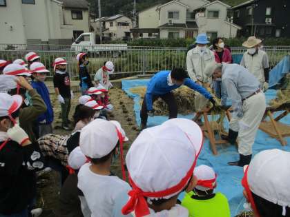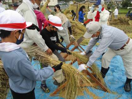 先週の稲刈りに続いて、脱穀の体験をしました。