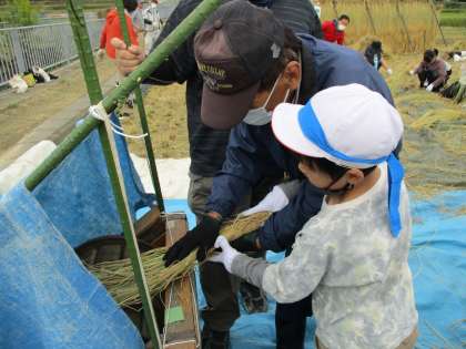 千歯こきと足ふみ脱穀機を用いて行ったのですが、