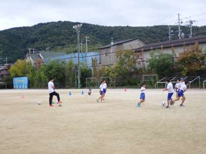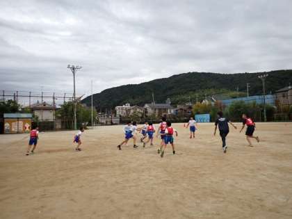 運動場では、サッカー部とタグラグビー部がボールを追いかけて頑張っていました。