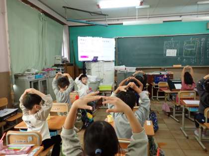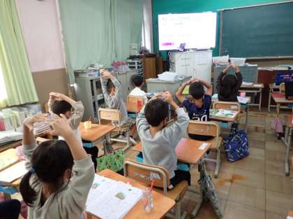 給食委員のお兄さんお姉さんが考えて作ってくれたクイズに答えている様子です。