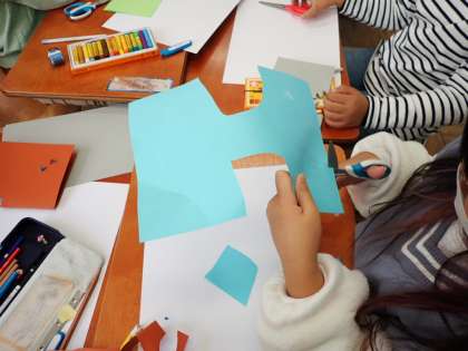 画用紙を切って、折り曲げて…何に見えるかを考えました。