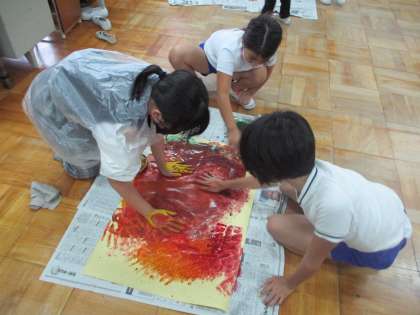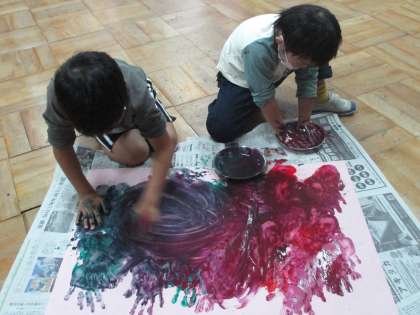 秋の葉っぱの色をみんなでつくりました。手を使って混ぜる感触を楽しんでいました。みんなで作った色を葉っぱのかたちにちぎって、秋ならではの作品が出来上がりました。