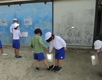 日光を鏡ではね返したらどのように進むかを調べる実験をしました。