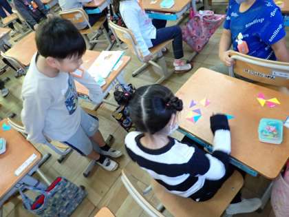 色板をひとつだけうごかして別の形にする活動の様子です。