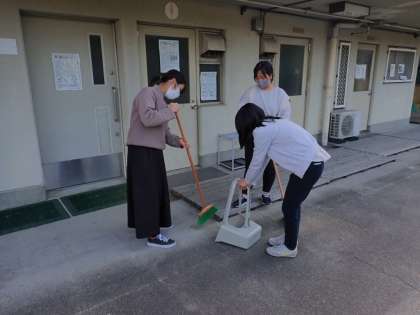 児童の下校後は教職員で体育館の周りをきれいにしたりもしました。