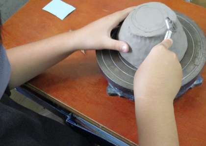 清水焼団地協同組合の方々に本日もお世話になり、お抹茶茶碗の作成の続きを行いました。今回は、底の部分を削っていき高台を作りました。お手本のようには、なかなか上手く削れなくて悪戦苦闘していましたが、丁寧に教えていただき世界に一つだけの素晴らしいお茶碗ができあがりました。