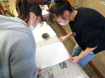 今日は彫刻刀で掘った絵に墨をつけて、刷りました。白い部分と黒い部分が上手に写り、いい作品が完成しました。