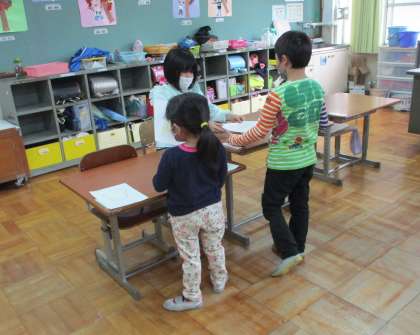 1年生の国語「ものの名前」の学習をするためには複数のおみせやさんが必要…といことで、高学年も協力してみんなでおみせやさんを開きました。「〇〇ください。」「どうぞ。」のやり取りができました。