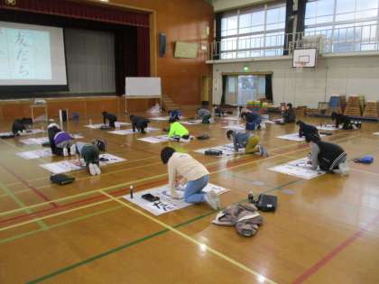 体育館で学年全員が集まり「春の海」をBGMに、お正月気分を味わいながら行いました。