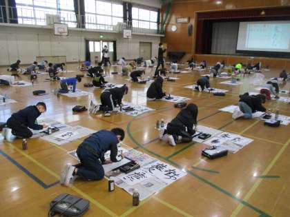 初めての画仙紙、初めての床で書いてみましたが、全員が集中して1枚1枚丁寧に書いていました。
