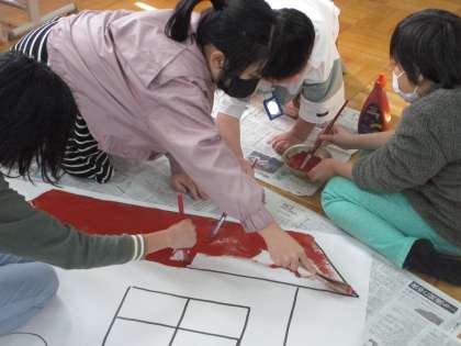 授業参観で「大きなかぶ」の劇をします。劇に向けて、大道具をみんなで作りました。普段使わない大きい筆を使っての色塗りにみんな夢中になって取り組んでいました。