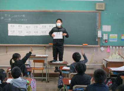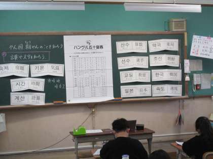 学活の時間に韓国・朝鮮について学習しました。ミュージシャンや食べ物など子どもたちに親しみのある写真を見てから、あいさつの言葉や似た音の言葉を学習しました。最後に自分の名前をハングルで書いてみました。