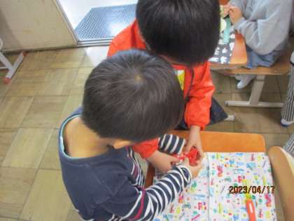牛乳パックの片付け方を教え合う姿もありました。