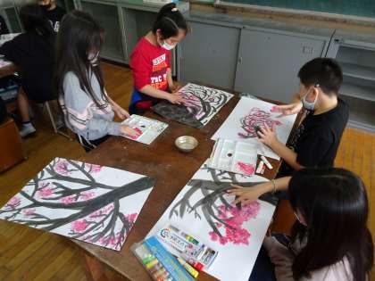 今日の図工の時間は、前回描いた木の幹に桜をつけました!