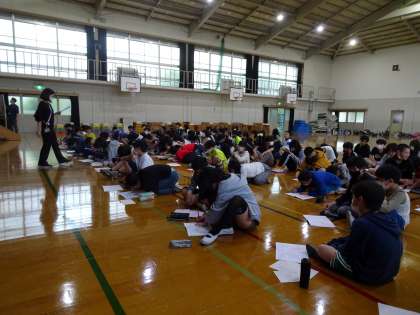 今日は雨によって6時間目の体育の学習ができなかったので、学年全員で集まり、修学旅行の行程や持ち物、きまりなどについて確認しました。