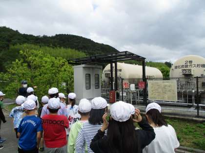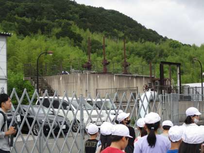 見学開始です。琵琶湖疏水の水に活性炭や炭酸ガスを入れ、水中の細かいごみを固めやすくします。下の写真の建物の中に琵琶湖疏水の水が貯められています。