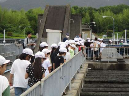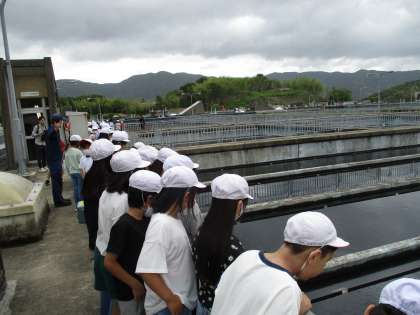 次に水中の細かいごみを固める薬品を入れます。細かいごみがだんだん大きくなっていく様子がよくわかります。