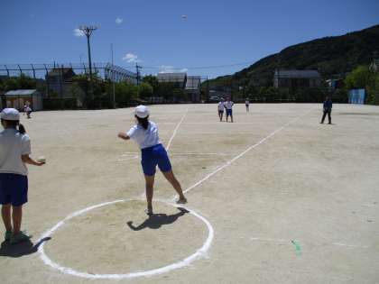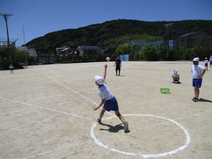 体育に時間にソフトボール投げをしました。4月の体育で遠投をしていた成果を発揮し、たくさんの子どもが昨年度の記録を更新していました。4年生の最高記録は、35メートルでした。