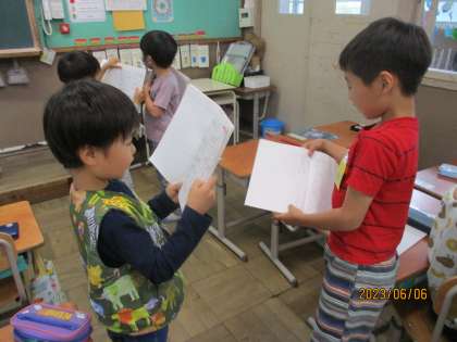 ノートに書いた文を、クラスの友達と紹介し合いました。