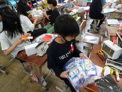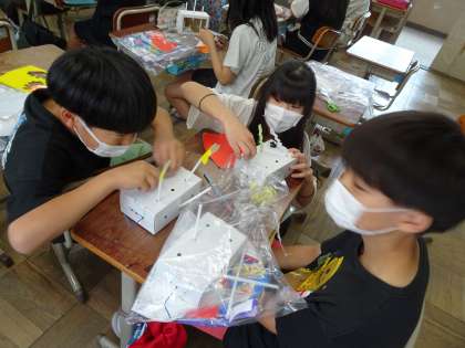 図画工作の時間に、「くるくるクランク」の作品に取り組んでいます。