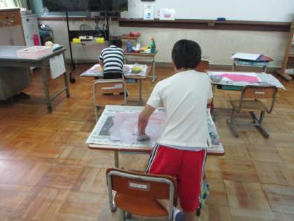とろとろえのぐをつかって、画用紙にいろいろな形を書きました。絵の具の感触や、混ざる様子を楽しんでいました。
