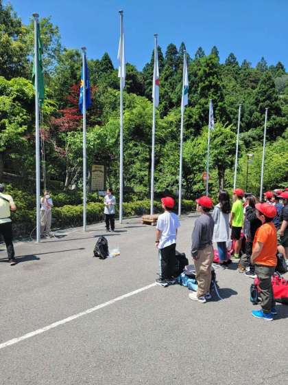 山の家に到着しました。入所式では、代表の児童が校旗をあげて、みんなで校歌を歌いました。所員さんの話も静かによい姿勢で聞くことができました。