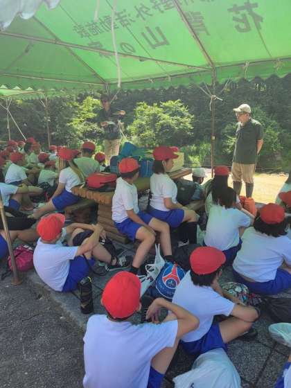親水広場まで移動して、川遊びスタートです。所員さんの話をしっかり聞いて、活動に向かいます。