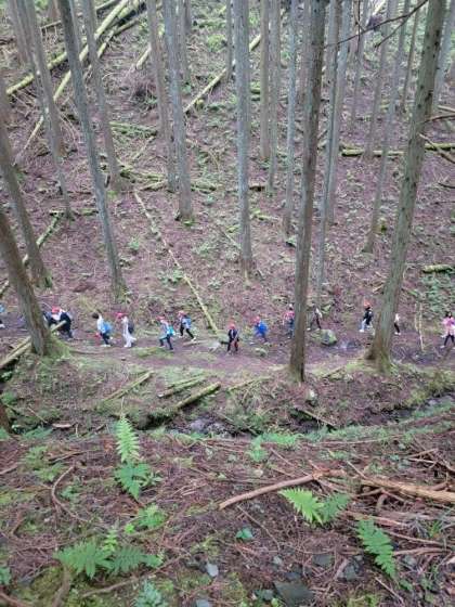 もうすぐ途中の休憩地点の和佐谷峠です。前を歩いてるグループが少し高いところから後ろを歩いてるグループに手をふっています。