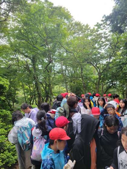 山頂に到着です。山頂で記念のグループ写真を撮影しました。しんどそうにしていた子達にも笑顔が見られてよかったです。