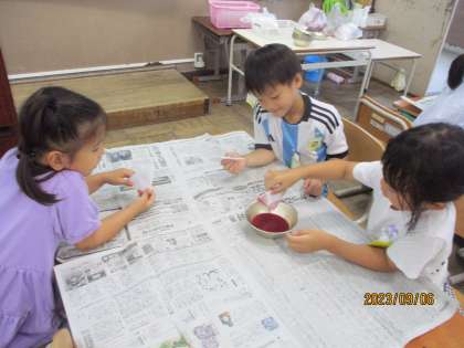 自分で育てたあさがおのお花を使って、色水あそびをしました。