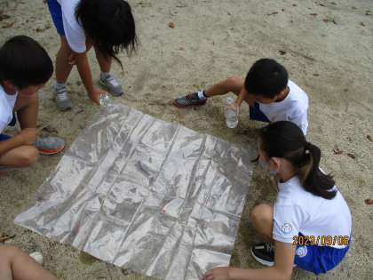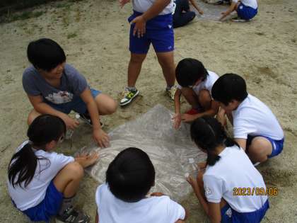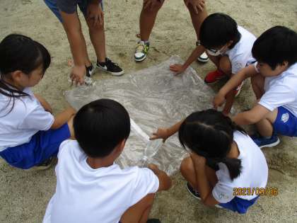 「水はどのように流れていくのだろうか」という学習問題を解決するために、地面にビニール袋を敷いてその上にペットボトルの水を流して観察しました。子どもたちは、高いところから低いところへ流れることとへこんだところに水がたまることに気づいていました。