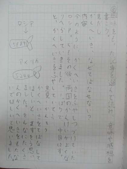 原爆や戦争に関連する記事が目にとまる児童がいました。