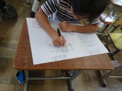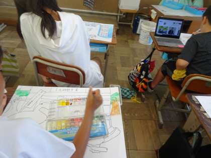 2組の図画工作「お話の絵」の学習では、色を付け始める子がいました。