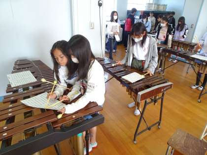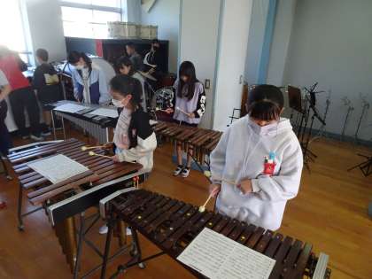 今日は、中間休みに木琴や鉄琴・ピアノ・大太鼓・小太鼓などの楽器を演奏したい子が集まり、練習を始めました!
