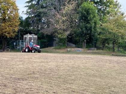 毎年この時期に芝生広場の種まきをしています。今回は、おやじの会の皆さんにご協力いただき、実施しました。