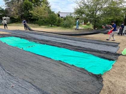 まず、業者の方に機械を使って土の表面を軽く掘り起こしていただいた後、芝生の種をまきます。そして、風で飛ばないように大きなローラーでしっかりと土を押さえ、最後にシートをかぶせました。