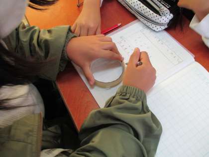 教室にあるものを使って円をかく活動では、