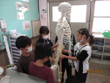 理科の学習で、はじめて第2理科室へ行きました。人体骨格模型を観察したり触ったりして,色々発見をしていました。