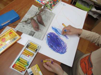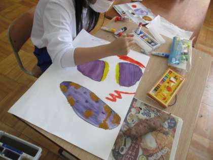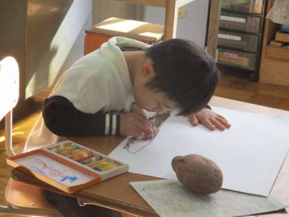 先週収穫したサツマイモの絵を描きました。じっくり観察して、色を重ねる等工夫して塗っていました。