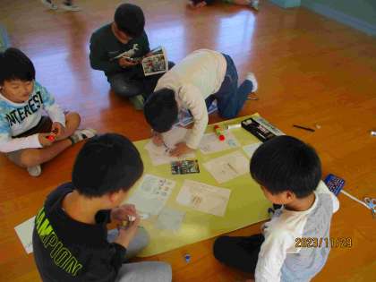 町探検で調べたことを発表するためにポスターを作っています。みんなで相談をしている姿がたくさん見られました。