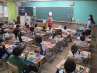 今月の身体計測の前に、養護教諭が保健指導「薬の正しい使い方」を行っています。この日は2年生が養護教諭の話を聞いていました。