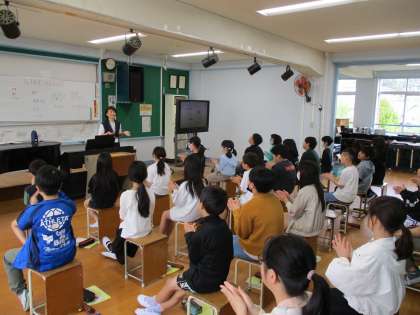 音楽の授業は、今年度から音楽のスクールサポーターで来られた先生による授業でした。「聞く」と「聴く」の違いを教えていただき、さっそく実践していました。
